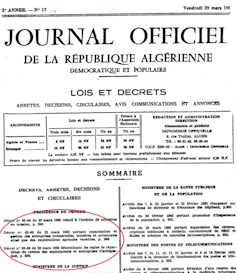 Journal officiel de la République algérienne portant publication des décrets du 22 mars 1963. Cliquer pour zoomer.