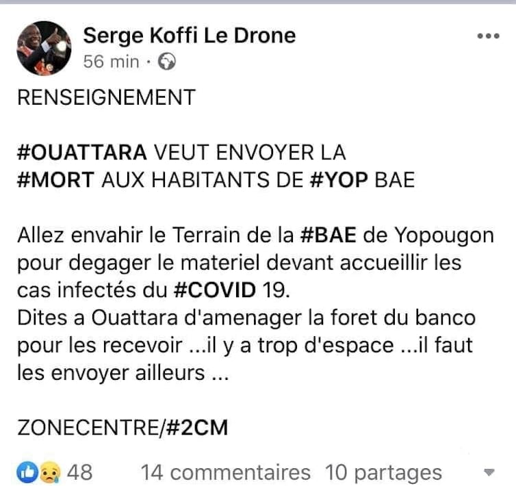 Toutefois, un mois après sa réélection à la présidence de la République, émaillée de violences, le 1er décembre 2020, sa page affichait « Attention coronavirus ». Ce message de sensibilisation a vite été décrié sur Facebook. Pour les opposants, ce post dévoile l’expression d’une mise en scène et un mépris de la classe dirigeante envers la population, tandis que le camp Ouattara s’est félicité de ce message de santé publique. Depuis, à chaque message de sensibilisation, des Facebookers reprennent avec dérision les propos du président de la République « On s’en fout de Corona » sur sa page personnelle ou d’autres pages d’État pour désavouer les mesures de santé publique.