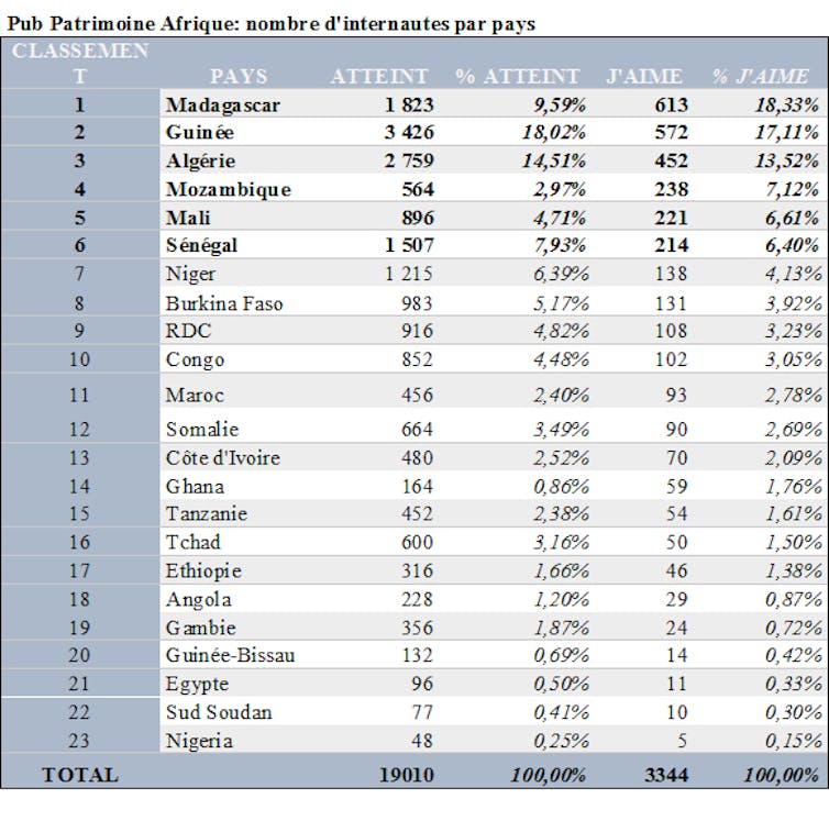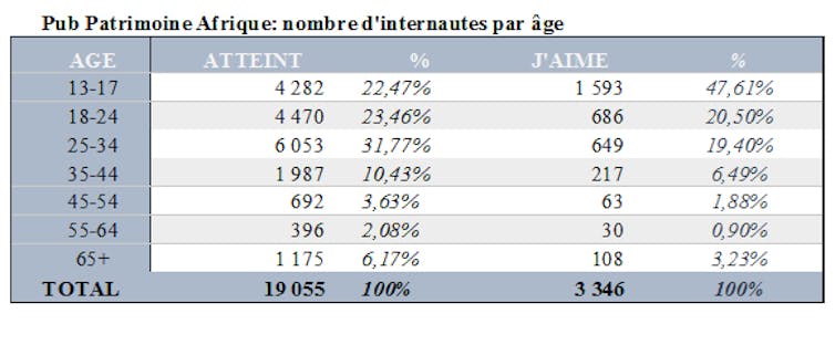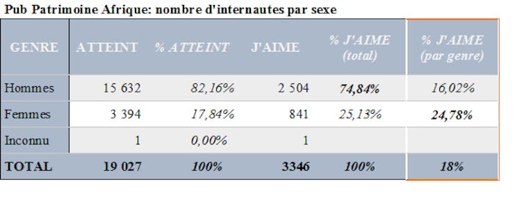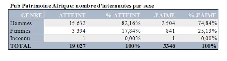 La page « Patrimoine Afrique » que nous avions créée dans l’année qui a précédé cette étude n’avait recueilli que 64 manifestations d’adhésion (« likes »), faute de promotion. À l’occasion de la campagne publicitaire initiée en ma qualité de chercheure, 3 346 personnes issues de l’échantillon ont manifesté leur intérêt, en « likant » la page.