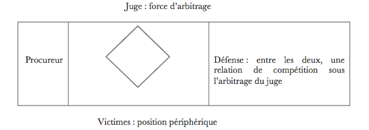 Ce losange s’interprète au regard de trois niveaux. Le plus élevé concerne le juge et sa fonction d’arbitrage. Le niveau intermédiaire, le plus médiatisé, oppose dans une relation d’intenses compétitions entre l’accusation et la défense pour faire admettre les preuves à charge et à décharge.
