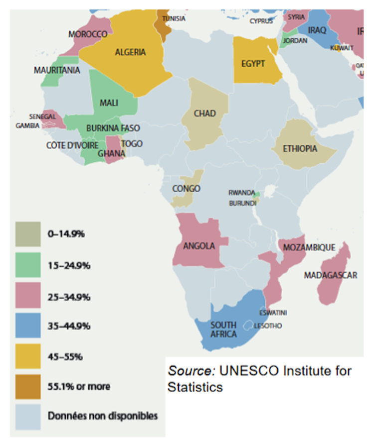 Le panorama de la recherche africaine est contrasté. D’ailleurs, la « recherche africaine » ne constitue en rien une catégorie homogène : les pays d’Afrique du Nord, de l’Est et du Sud sont, en effet, dans des situations plus favorables que les pays d’Afrique de l’Ouest et du Centre qui s’avèrent, quant à eux, particulièrement en retard. Les pays francophones sont ainsi largement distancés par les pays anglophones. En termes de genre, les disparités hommes/femmes restent fortes à l’échelle du continent, comme en atteste la carte ci-dessous.