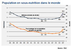 Au moment du démarrage de la guerre, la FAO estimait à environ 810 millions le nombre de personnes souffrant de la faim dans le monde. Après trois décennies de baisse, ce nombre s’est stabilisé durant la décennie 2010, pour remonter en 2020 et 2021 sous l’impact du Covid.