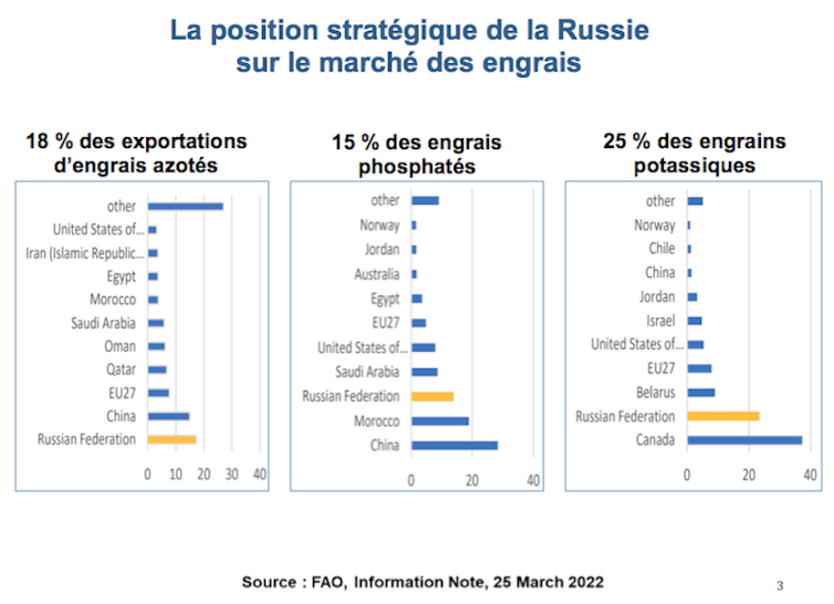 La Russie est le premier exportateur mondial d’engrais, avec une position forte sur les engrais azotés ou sur les composants permettant de les fabriquer (ammoniac et nitrate d’ammonium). Avec son allié biélorusse, elle domine également le marché des engrais à base de potasse.