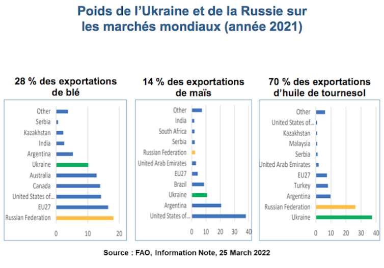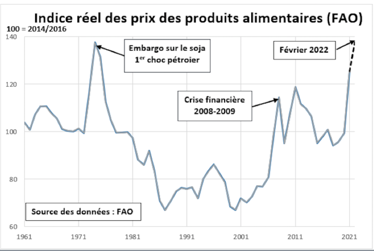 Le déclenchement de la guerre en Ukraine a brusquement interrompu la totalité des exportations de céréales et d’oléagineux depuis l’Ukraine et une grande partie de celles de la Russie qui transitent par la mer Noire. L’interruption a provoqué une envolée des cours du blé, du maïs et des oléagineux, trois composantes majeures de l’indice du prix des denrées de base calculé par la FAO depuis 1961.