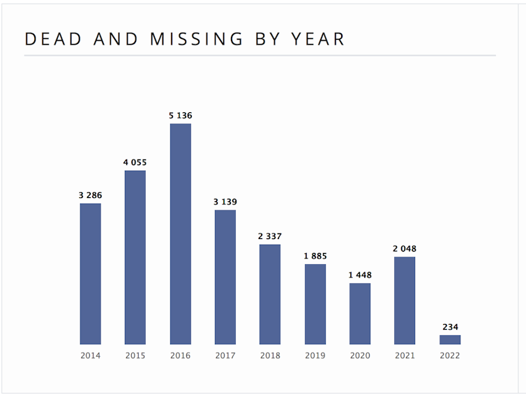 Nombre de personnes ayant disparu ou étant mortes en mer Méditerranée par année. Missing Migrants Project, (IOM).