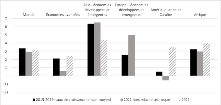 En dehors de cet effet rebond, la croissance africaine en 2021 est en fait très proche de celle observée en moyenne avant la pandémie (+3,0 %, contre +3,2 % de taux de croissance annuelle moyen pour la période 2015-2019). Elle s’accélère en 2022 pour atteindre 4,0 % selon les estimations du FMI (à noter que les chiffres annoncés pour 2022 et 2023 dans cet article reposent sur des prévisions et sont donc amenés à être révisés).