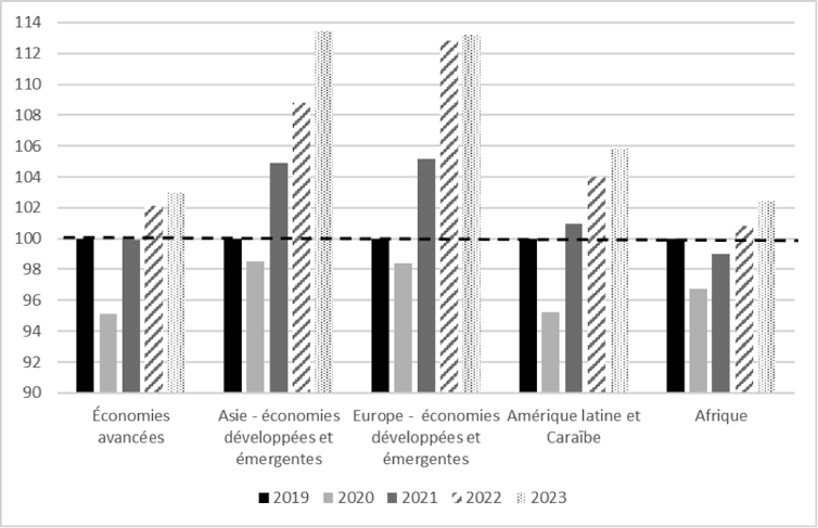 En raison de la croissance démographique, qui reste rapide sur le continent (+2,5 % de croissance annuelle moyenne entre 2015 et 2020, contre +1,1 % au niveau mondial), le rattrapage en termes de PIB par habitant y est bien plus lent. Pour cette raison, l’Afrique ne retrouvera son niveau de PIB par habitant antérieur à la pandémie qu’en 2023 (graphique 2), quand la plupart des autres régions ont pu le recouvrer dès 2021.